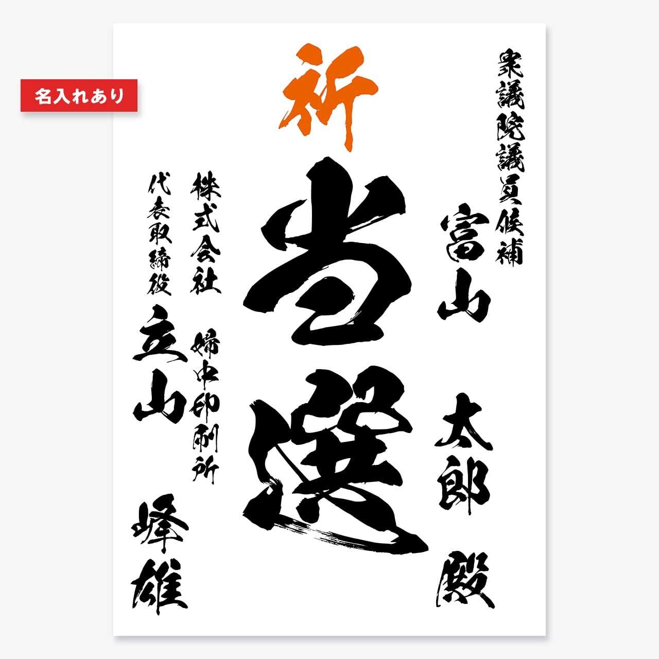 候補者様や応援者様のお名前の印字が可能です。手書きの手間を省き、統一感のある仕上がりで納品いたします。